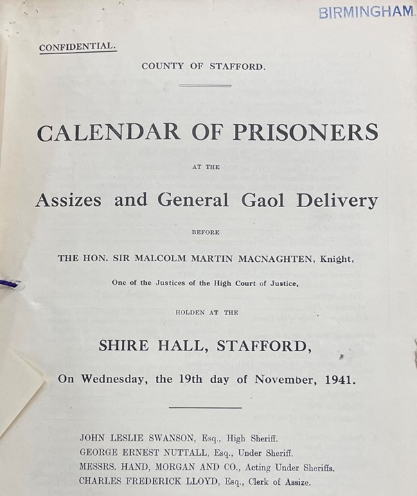 On Wednesday 19 November 1941, The Honourable Sir Malcolm Martin Macnaghten, a Justice of the High Court, presided over 16 criminal cases held at the Shire Hall, Stafford. Of these, 6 involved serving British soldiers. Two were charged with Bigamy, one with Rape, one for Murder and two for Attempted Murder.